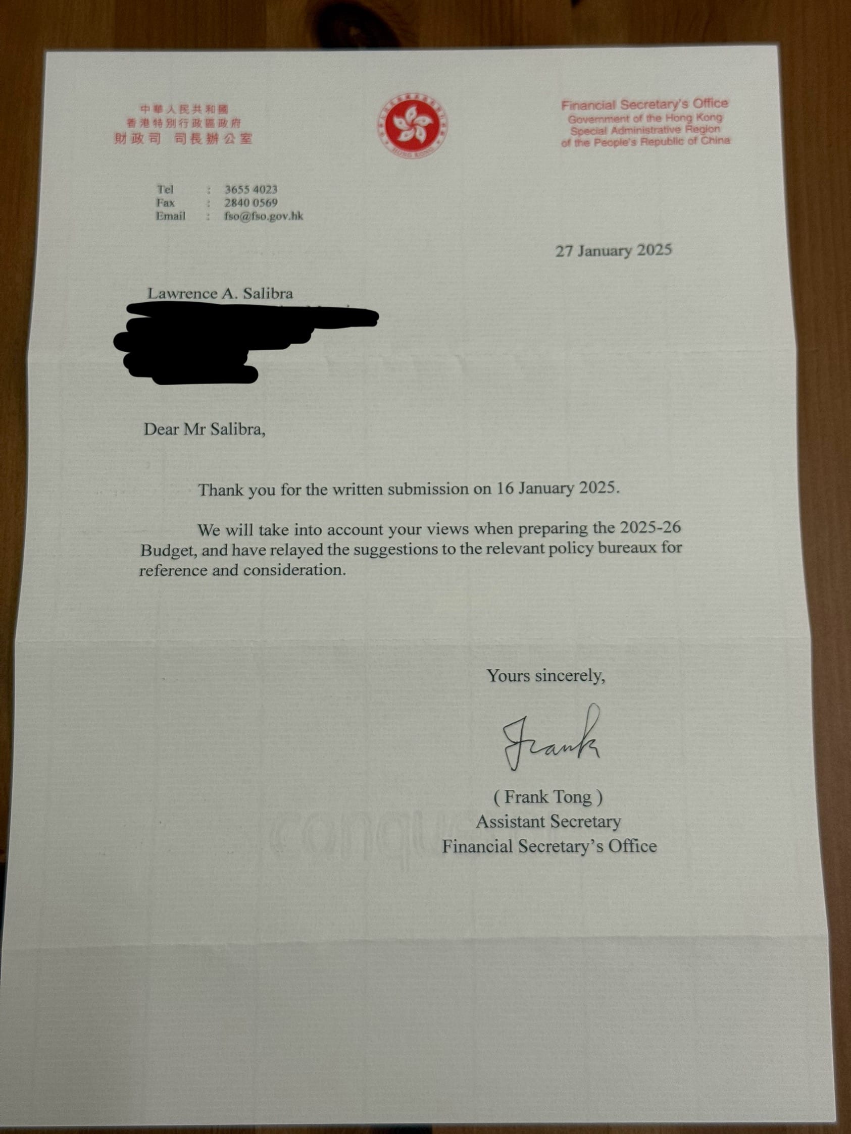 I write to you regarding your request for input on the 2025-2026 Hong Kong Budget.