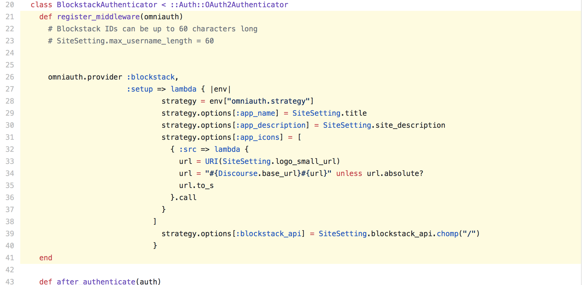 In our Discourse implementation, our next step is to integrate our blockstack-ruby's verify_auth_response method and some client-side code from blockstack.js into a Blockstack-specific strategy for the Omniauth authentication system used by Discourse.