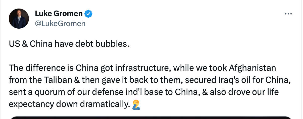 I came across the following post on X a couple days ago talking about how US debt comes from spending on war while Chinese debt is from spending on infrastructure: