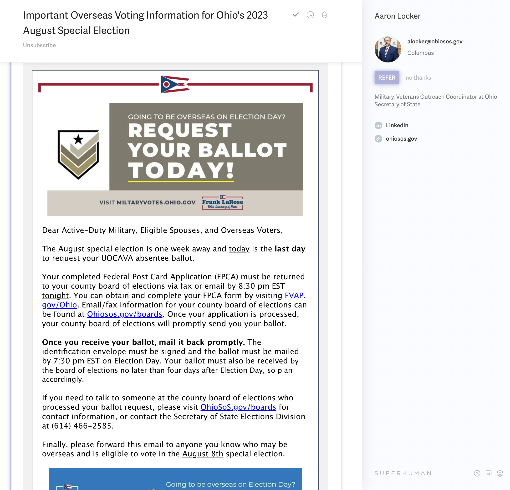 For those of you that aren't aware, in Ohio, the process of voting absentee involves asking a county agency (there are many counties in Ohio) for a piece of paper and mailing it back from your overseas home. They'll send you a ballot wherever you want in the world and there's no real way that I could ever figure out that they can tell if the person requesting the ballot is eligible to vote. If you can't be bothered to ask for a ballot, you can also just print your own and send it in. All you need is the name, birthday and address of a voter...all of which is public information. What always confused me was that the deadline for sending the ballot back was such that there was no way it could arrive in time to actually be counted.