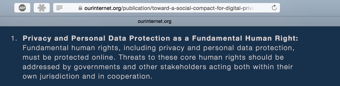 Friend +liongrass pointed me to an organization called the "Global Commission on Internet Governance" that released a statement calling privacy "fundamental human right" on their open source website. Lofty goals and admirable words.