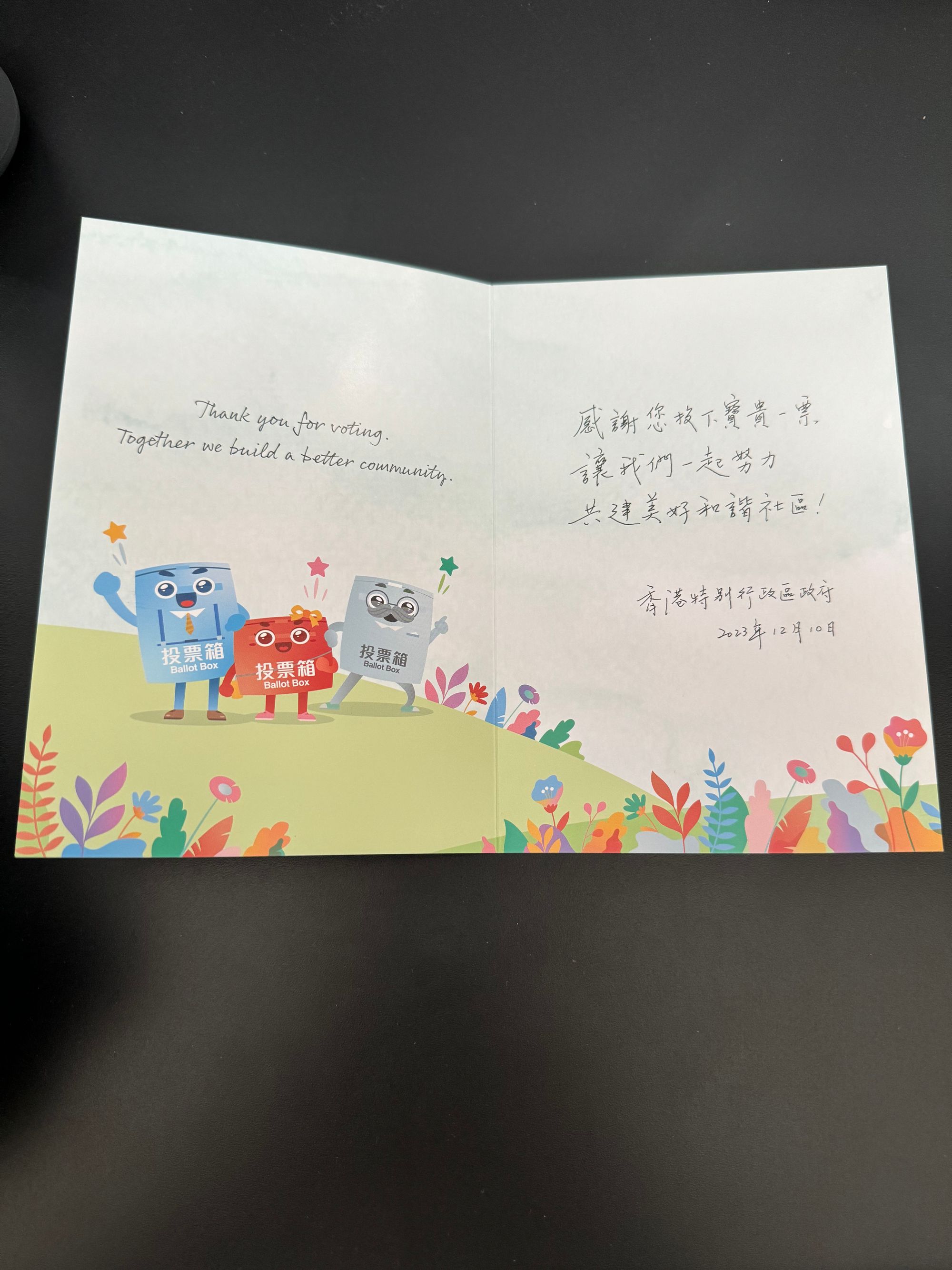 Despite being unable to vote, the poll staff kindly gave me a "Thank you for voting" greeting card.